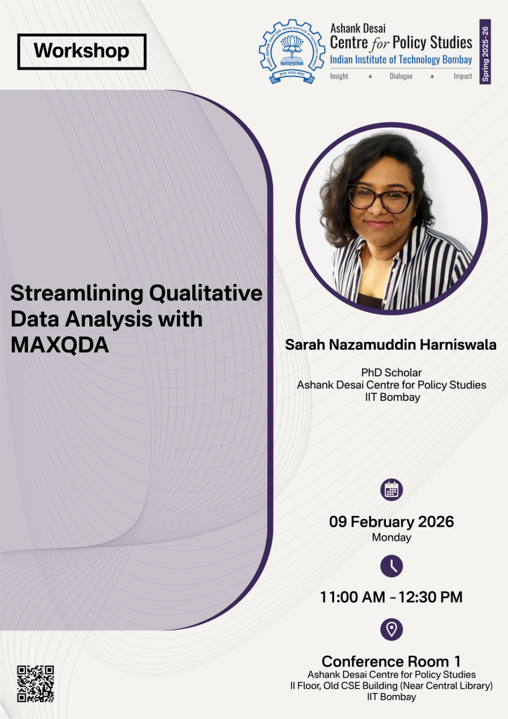 Speaker Bio-sketch: Ms. Sarah Nazamuddin Harniswala is a PhD Scholar at the Ashank Desai Centre for Policy Studies, IIT Bombay. Her ongoing research focuses on the parliamentary discourse on films in India, mapping the trajectory of legislative construal and engagement through the lens of the Multiple Streams Framework. She holds an MPhil in Development Studies from Jamia Millia Islamia, where her dissertation explored the intersection of State policies and sexual minorities. Additionally, she has an MA in Public Administration from Jamia Millia Islamia and a BA in Political Science (Hons.) from St. Xavier’s Autonomous College, Kolkata.
