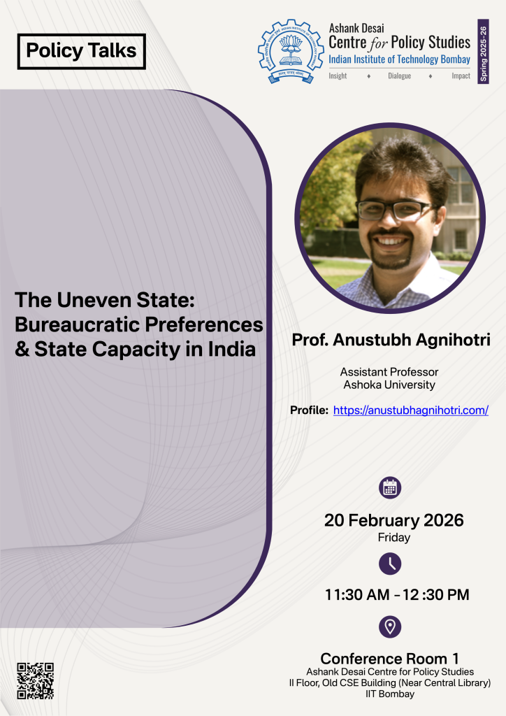 Speaker Bio-sketch: Anustubh Agnihotri is an Assistant Professor of political science at Ashoka University. His research focuses on understanding how public bureaucracies shape the effectiveness of local governance and the delivery of public services. He has also worked on projects that study how new technologies are adopted and scaled in resource-poor contexts. Anustubh finished his PhD in Political Science at the University of California, Berkeley. He also holds a Master’s in public policy and a Master’s in Electrical Engineering from The University of Texas at Austin and a Bachelor’s in Electronics and Telecommunications from Pune University. Profile: https://anustubhagnihotri.com/